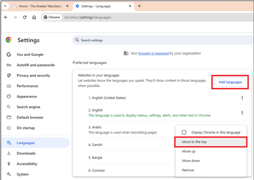 Step 8: ‘Click’ ‘Move to the top’. The first language on the top of the list will be the display language.