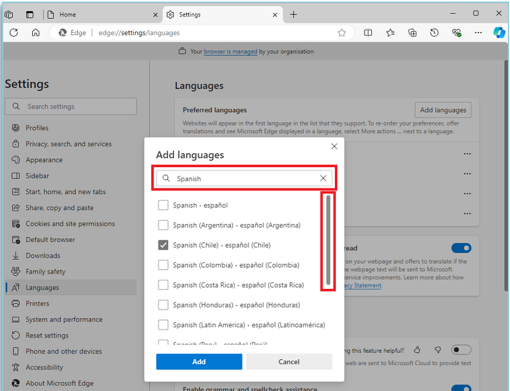 Step 5: A popup window titled ‘Add Languages’ will appear on the screen. You can either ‘type’ or ‘scroll’ through the list of languages, then click the checkbox on the left side of the language you want to add.